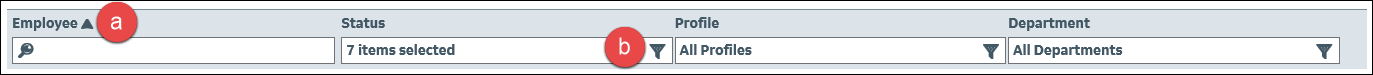 Filter the list by making selections in the Employee, Status, Profile, and organization unit boxes. You can filter the Employee column by typing an employee name or entering an employee code.