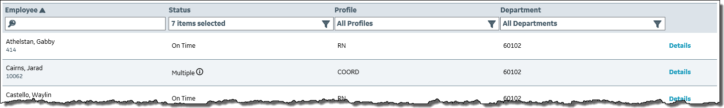 If Multiple appears in the Status column, then there are at least two statuses that apply to the employee. For example, if the employee clocked in to a unit that is different than the unit they were scheduled in, they would have one status of, for example, On Time and a second status of Labor Distribution Mismatch.