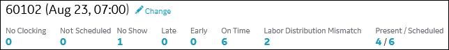 Shows the number of present employees (clocked in) and the number of employees scheduled.