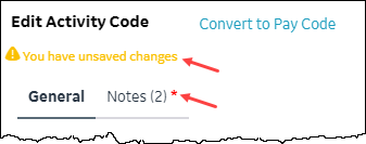 If you make changes to the transaction or add a new transaction note, but then switch between the General and Notes tabs before saving, a message reminds you that you have unsaved changes and the tab with the unsaved changes shows an asterisk.