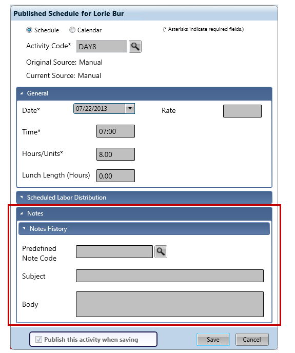 The Add Transaction Note function is used to attach a note to an employee schedule. This note can give information such as why an employee came in late or left early or any other information.