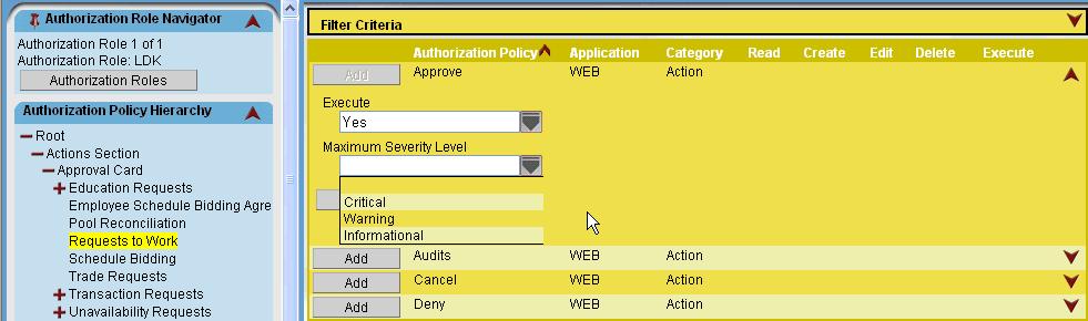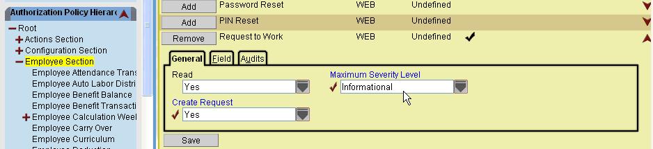 The following screen print shows the location of the access to the supervisor approval screen for the Request to Work feature. The Maximum Severity Level field indicates the level of validation exception message that users can override, if any.
