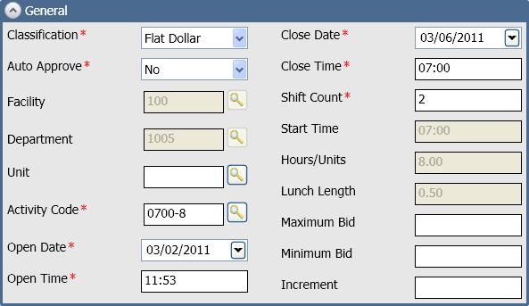 If needed, enter or update the Open Date, Open Time, Close Date, and Close Time.