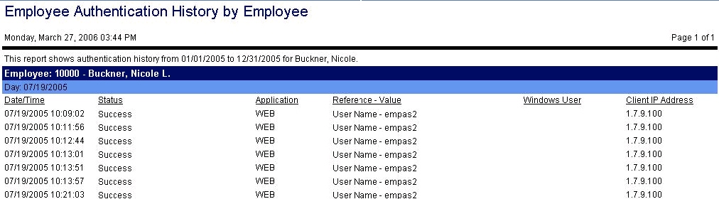 This report shows the login history of the employee during the indicated date range. Field information includes the date and time of each login attempt, the status of the attempt, such as success or user not found in system, the application the employee logged into, the user name, the windows user name (if applicable), and the client IP address where the user logged in.