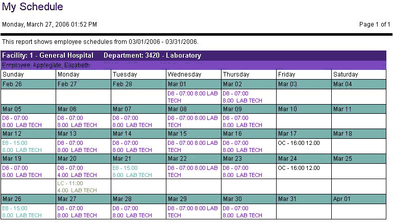 This report creates individual work schedules in a calendar format for the logged in employee. For each day with a schedule, the report lists the activity code, start/end times of the schedule and the staffing profile assignment.