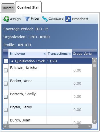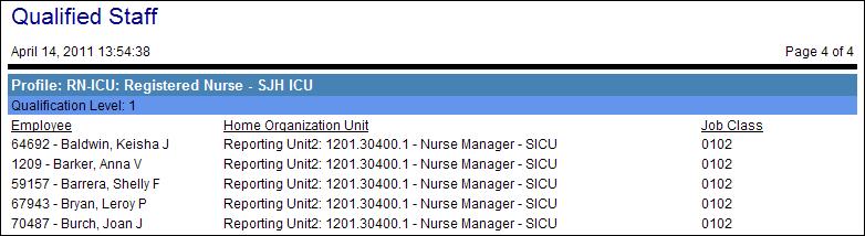 This report allows you to view a list of employees who are qualified to work in an organization unit. The employees are the same as those found on the Qualified Staff tab on the Current Staffing Overview screen.