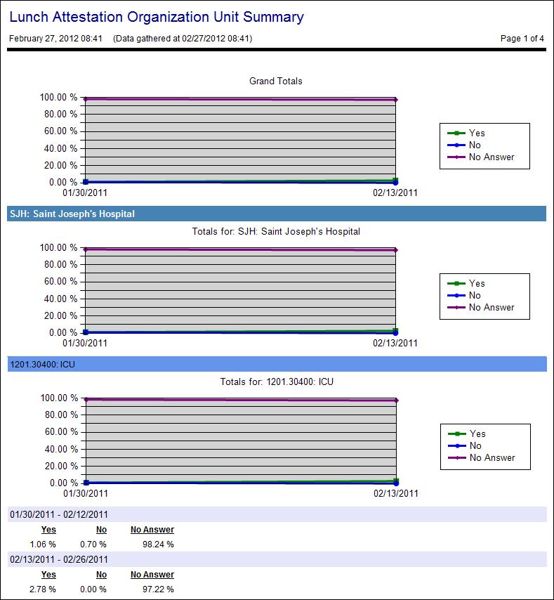 This report shows a summary and a graph of all the lunch responses (by percentage) for the selected organization units. If an organization unit employee's pay period falls within the date range, data for the entire pay period is returned.