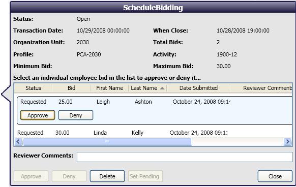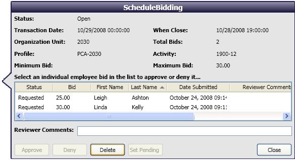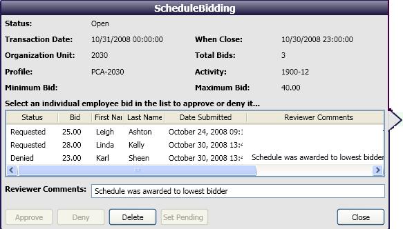 Authorized users can view the details of the Schedule Incentive requests, including the employees who have submitted bids and the amounts of the bids. The can also handle requests from this screen, approving or denying bids.