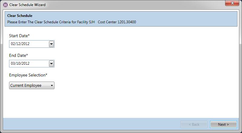 The Clear schedule function opens a wizard used to clear employee schedules for the indicated time frame. Schedules can be cleared for the entire open schedule period or for a shorter time frame within the open schedule period.
