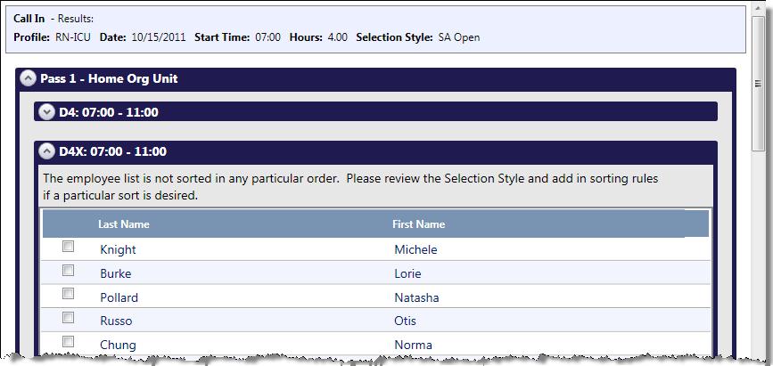 A list of qualified employees appears. Employee names appear under each pass that they qualified for, listed in the order determined by the sorting rules.