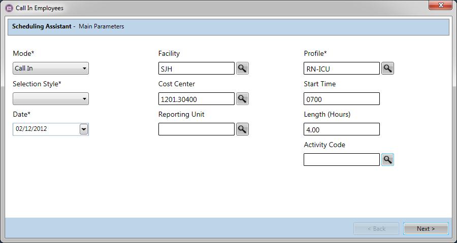The Call In scheduling assistant function opens a wizard used to search for qualified employees to fill a schedule opening. Selected employees are then added to the schedule screen.