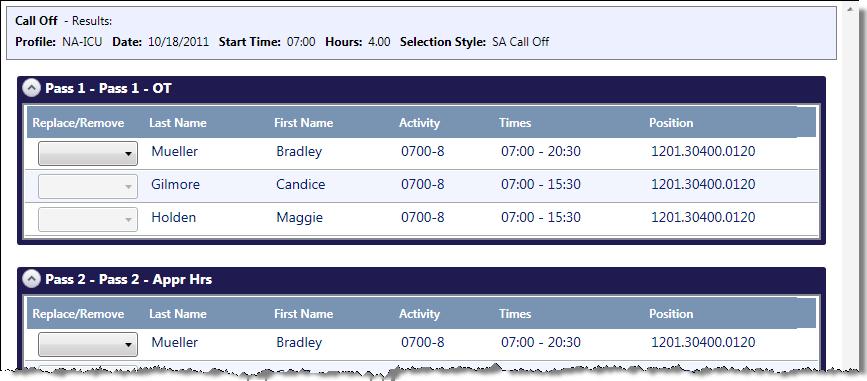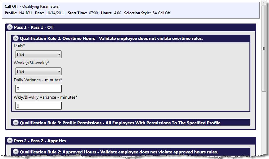 The system then determines which employees are eligible to be called off based on the qualification rules set up on the specified selection style. The scheduling assistant may run multiple passes. For example, the first pass may look for employees who are over their overtime hours and the second pass for employees over their approved hours.