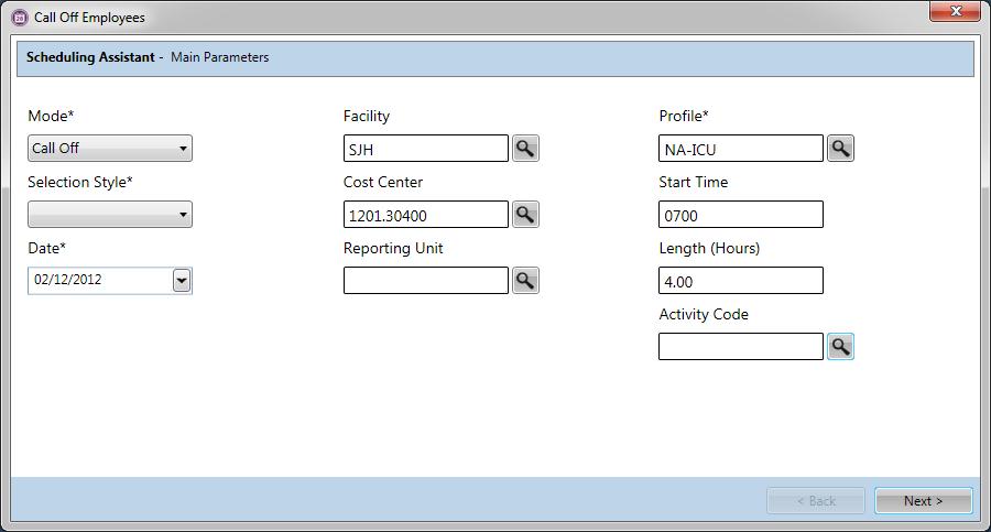 The Call Off scheduling assistant function opens a wizard used to search for employees who are working during the selected time frame to identify employees to call off or send home. All or a part of the schedules of the selected employees can be removed from the schedule screen and the employees can be given an alternate activity code or pay code, such as a low census code.