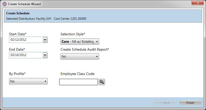 The Create Schedule function opens a wizard used to run the scheduling process for the open organization unit or schedule group.