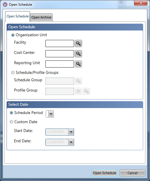 An archived schedule can be opened by accessing the Open Archive tab and completing the screen displayed.