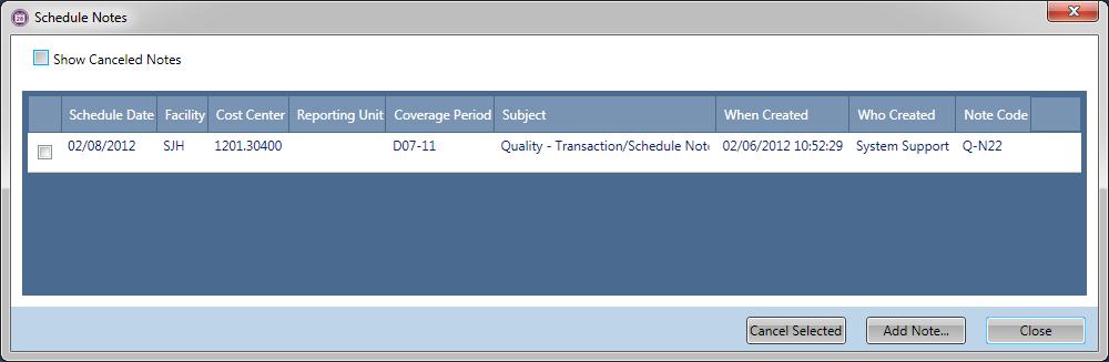 The user can include schedule notes that were canceled by checking the box to the left of Show Canceled Notes in the upper left corner.