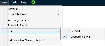 The Styles option allows the user to choose whether to display published scheduled activity boxes in solid color or transparent with a bold colored border around the box.