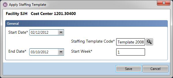 To apply a staffing template to a date range outside the range of the open schedule, close this screen, open the schedule to a date range which includes the entire date range to apply, and then reopen this function.