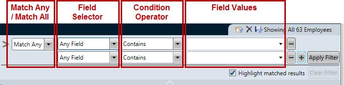 The employee or schedule must include the value entered in the Field Value field. For example, if the Field Selector is Job Class and the user types "nurse" in the Field Value field, the filter will include all job classes that have "nurse" in the description.