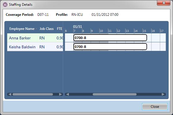 The Staffing Details screen is opened by double-clicking on a cell in the balancing grid or by accessing the right-click menu. The view shows the employees who are providing coverage for the profile/coverage period that is highlighted in the grid.
