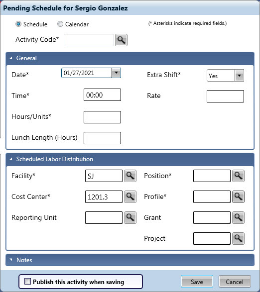 Some of the information in this screen is already defaulted from the schedule screen, and other information is defaulted once the activity code is filled in. The defaulted information can be left or replaced with different values. Type in the value or click the search icon